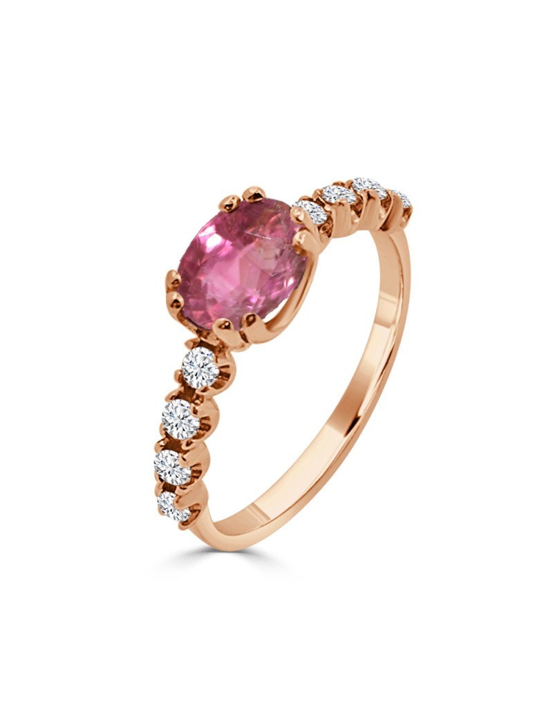 Romántico por naturaleza, audaz por esencia. Este anillo deslumbra con una turmalina rosa de talla oval de 6x8 mm con dulzura intensa, sostenida por ocho garras que abrazan su luz como un secreto preciado. A cada lado, cuatro diamantes brown (0,28 ct en total) aportan calidez y profundidad, como susurros de oro viejo al caer la tarde.