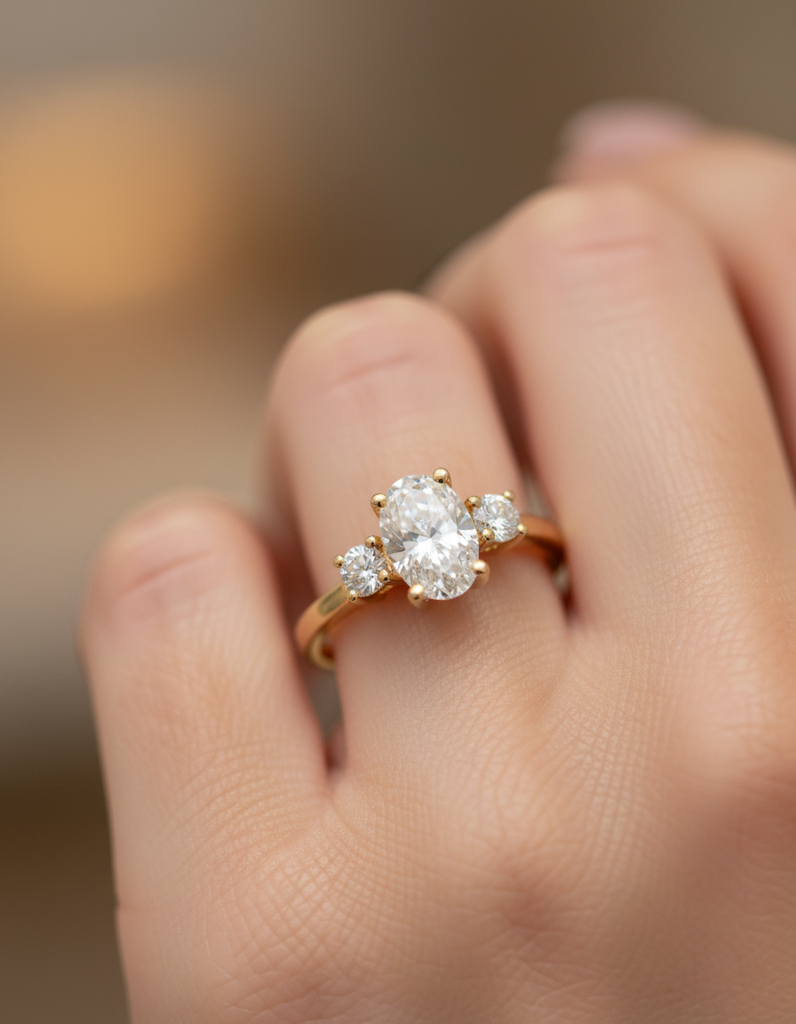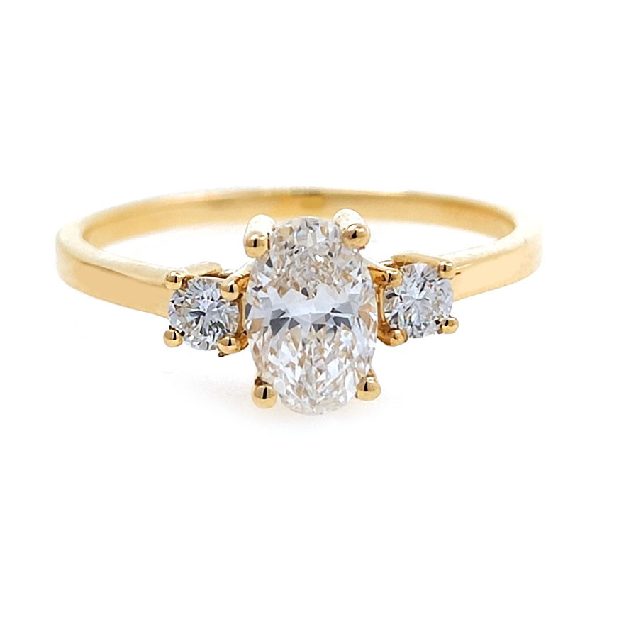 El anillo trilogía Budapest destaca la luz pura de un diamante oval GIA 0.60ct (E-VS) acompañado de dos diamantes talla brillante, engastados en cálido oro amarillo 18k. Su elegancia, una promesa eterna.