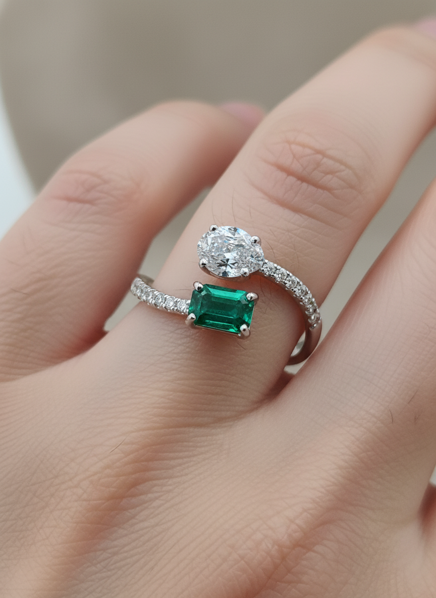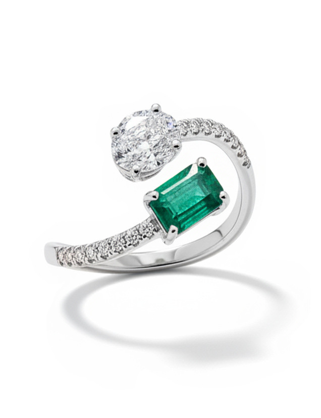 Elaborado en la nobleza del oro blanco de 18 quilates, este diseño abierto Toi et Moi (Tú y Yo) es una obra de arte que celebra la unión de dos gemas excepcionales. Por un lado, una esmeralda natural de 0.49 quilates, cuya talla princesa de líneas precisas irradia un verde profundo y magnético; frente a ella, un diamante natural talla oval de calidad G-VS, que aporta un brillo clásico y deslumbrante.