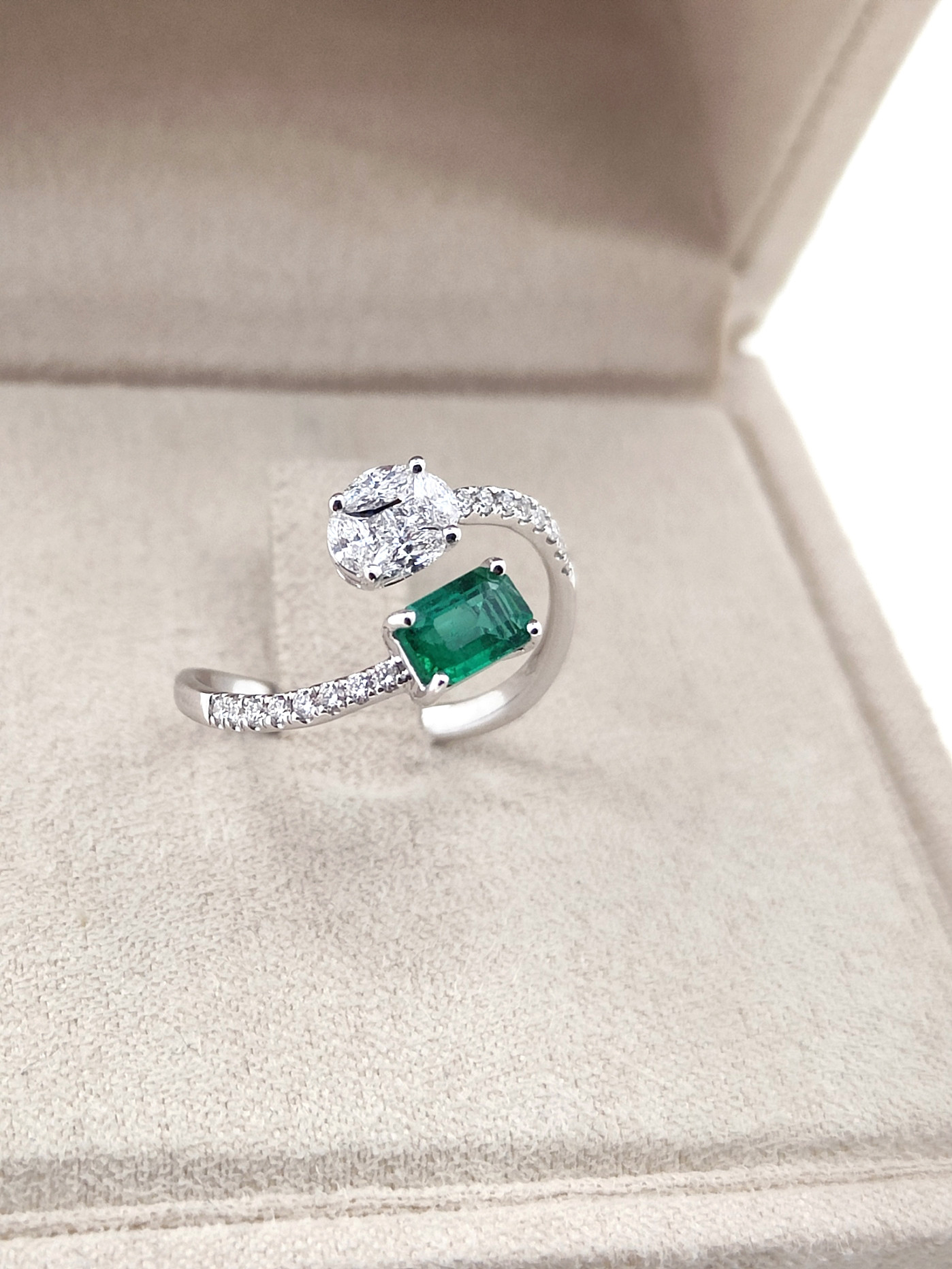 Anillo de diamante y esmeralda en oro blanco de 18k. Su diseño abierto une un diamante oval con una esmeralda talla princesa de 0.49ct en un encuentro lleno de luz y armonía. Un delicado pavé de 21 brillantes recorre el brazo, sumando un total de 0.84 quilates en una joya inolvidable