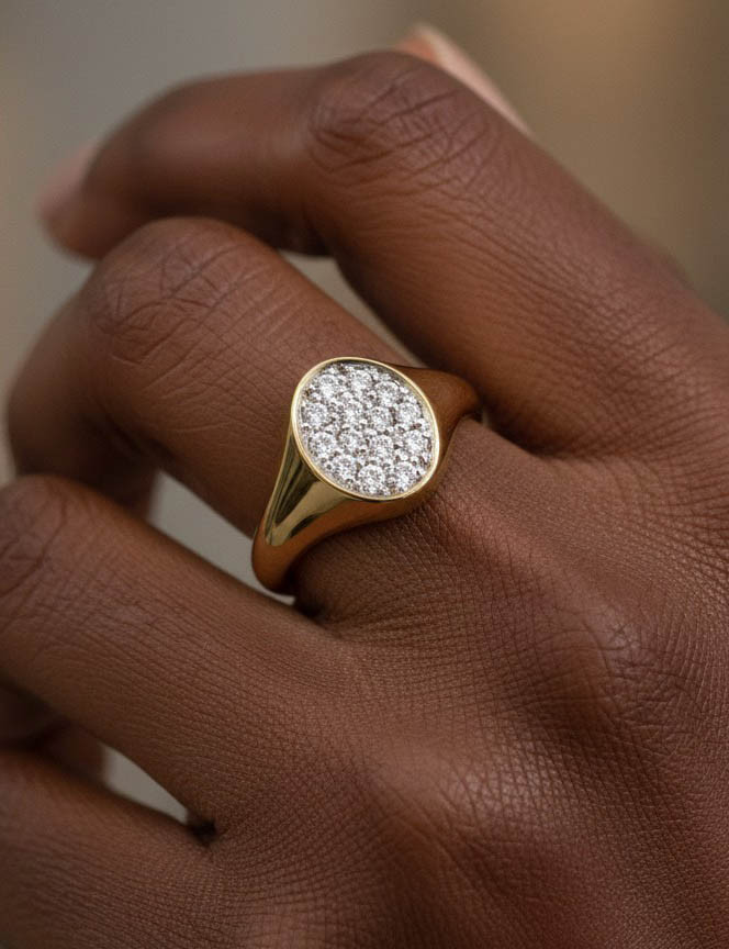 Sortija de estilo sello con cabeza ovalada engastada en pavé de diamantes talla brillante, en oro amarillo de 18 quilates. Destaca por su diseño robusto, acabado pulido y elegancia versátil, perfecta para el día a día o como inversión en alta joyería.