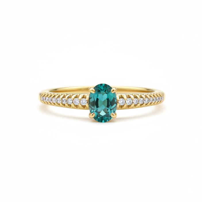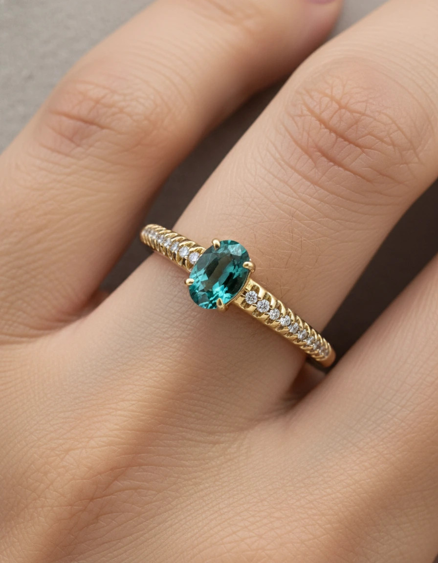 Un clásico eterno en oro de 18k: la esmeralda ovalada, engarzada con 20 diamantes talla brillante , revela una historia de luz, elegancia y compromiso.