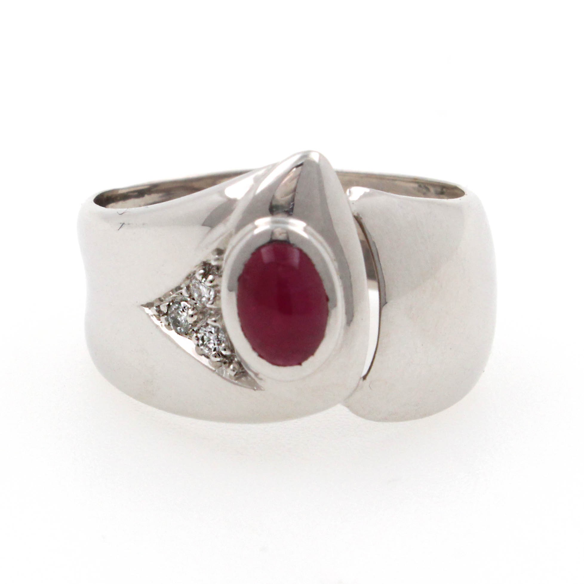 Anillo de Oro Blanco con diamantes 0,05 quilates y rubí talla cabujón
