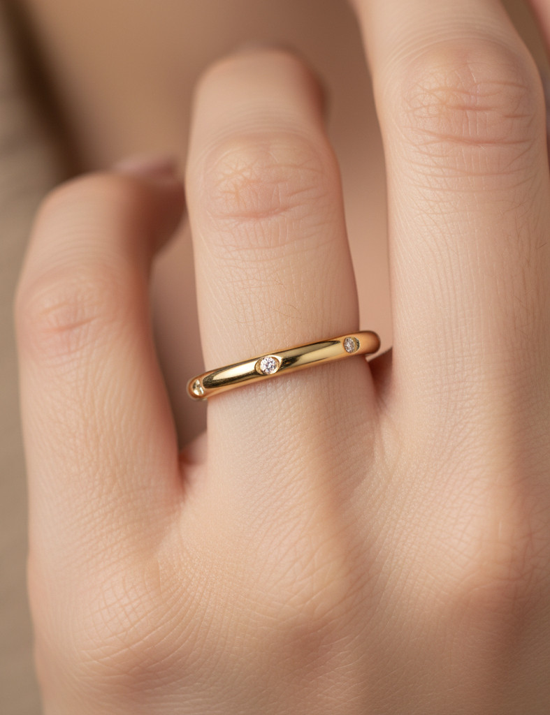 Anillo en oro amarillo de 18 quilates con diseño minimalista y elegante, adornado con pequeños diamantes engastados a ras que salpican su superficie, aportando un brillo sutil y sofisticado. Perfecto para llevar solo, como alianza de boda o combinado con otros anillos.