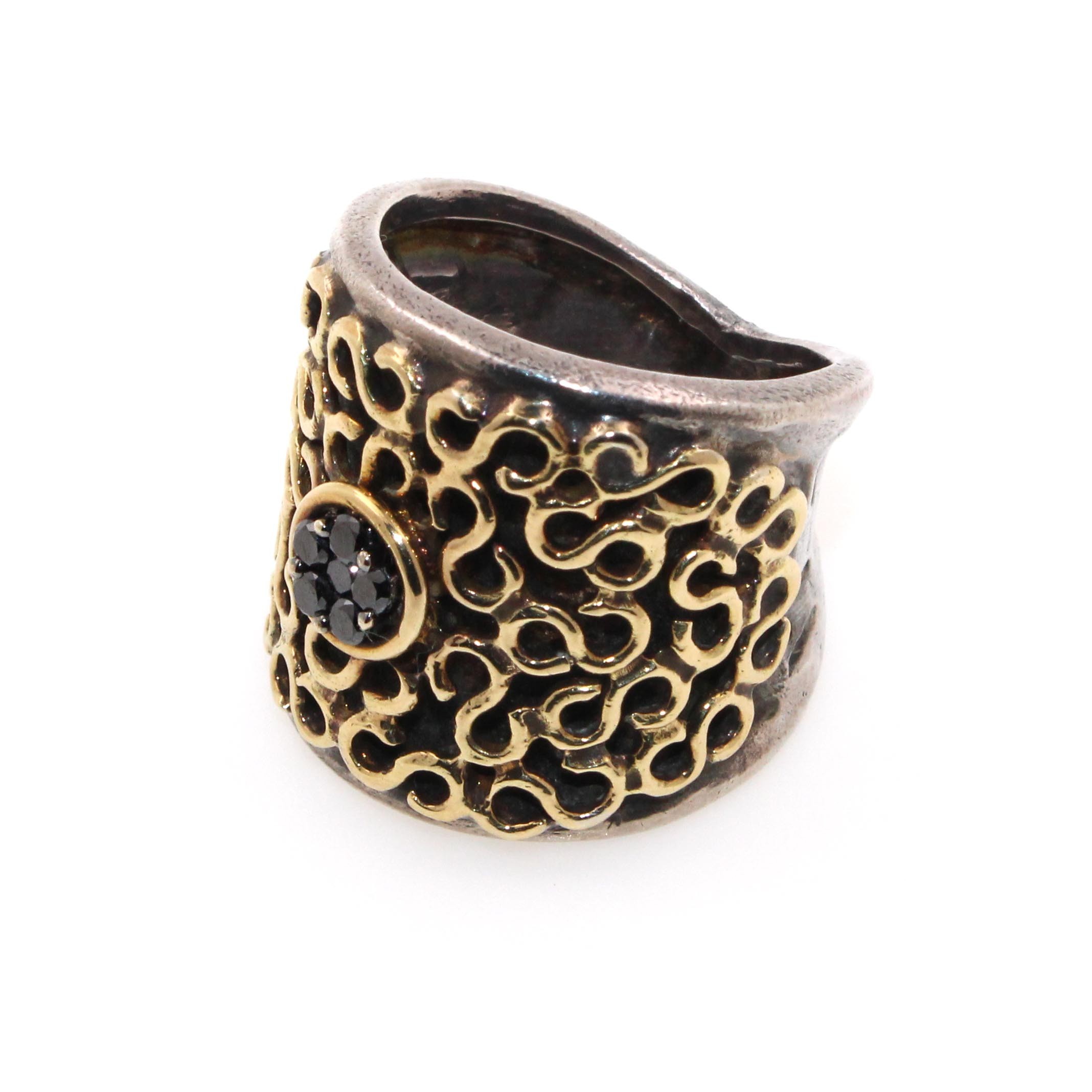 Anillo ancho con diseño de ondas doradas y 5 diamantes negros.