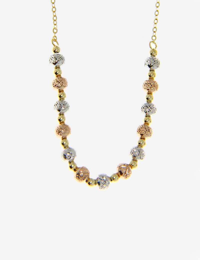 Collar de bolitas de oro tricolor 18 kilates. Una gargantilla original elaborada en oro blanco, amarillo y rosa. Longitud 42 cm.