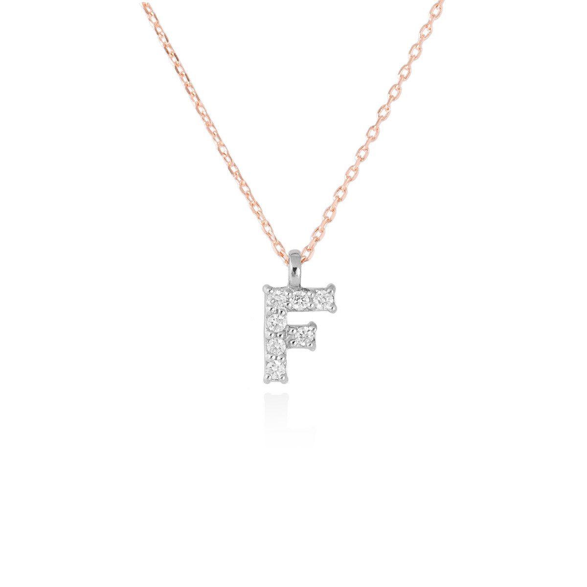 Gargantilla de oro amarillo y oro blanco con colgante letra F de 7 diamantes que pesan 0,08 quilates color Top Wesselton (G) y pureza S.I. Altura de la letra 6mm. Incluye cadena de longitud standard de 40-42cm.