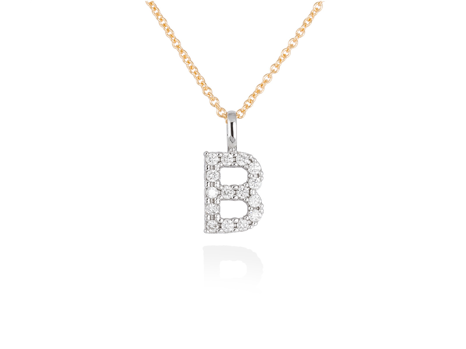 Celebra tu identidad o la de un ser querido con esta exquisita gargantilla. La inicial "B", finamente elaborada en oro blanco de 18k, resplandece con la luz de 0,15 quilates de diamantes Top Wesselton. Altura de la letra 10mm.