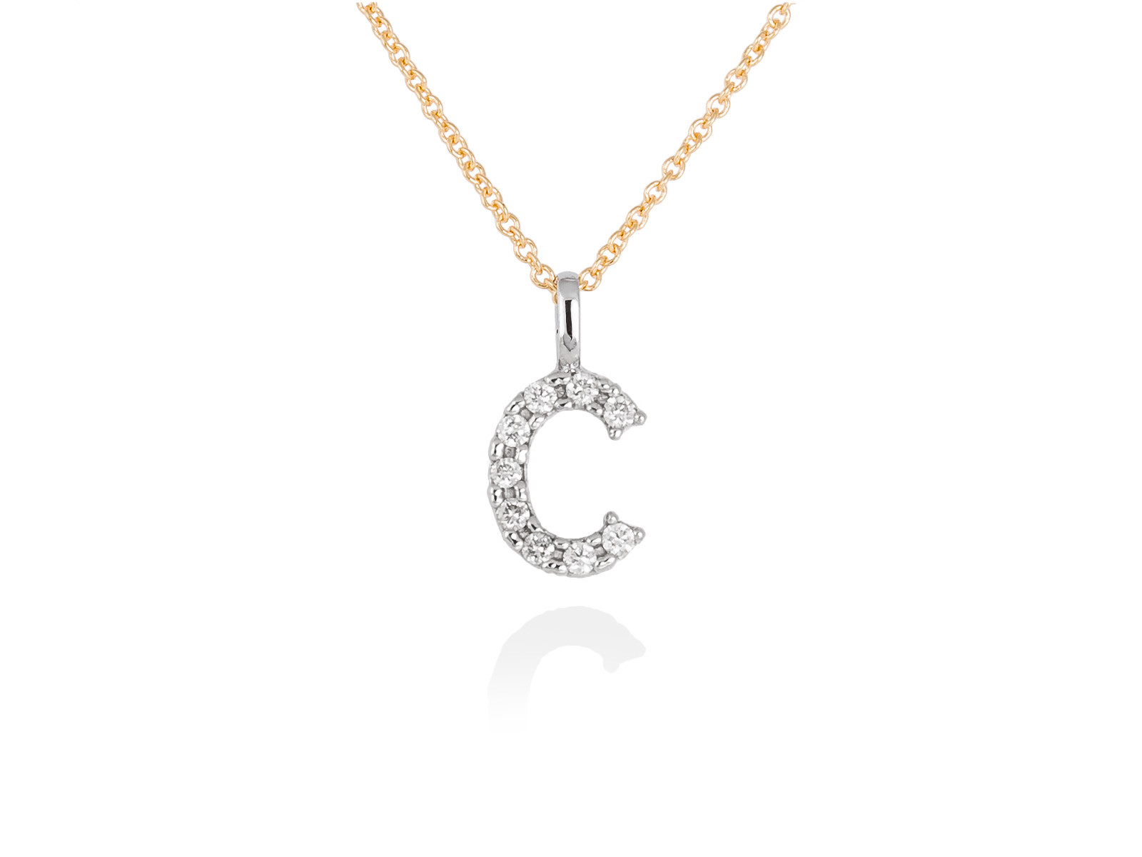 Celebra tu identidad o la de un ser querido con esta exquisita gargantilla. La inicial "C", finamente elaborada en oro blanco de 18k, resplandece con la luz de 0,09 quilates de diamantes Top Wesselton. Altura de la letra 10mm.
