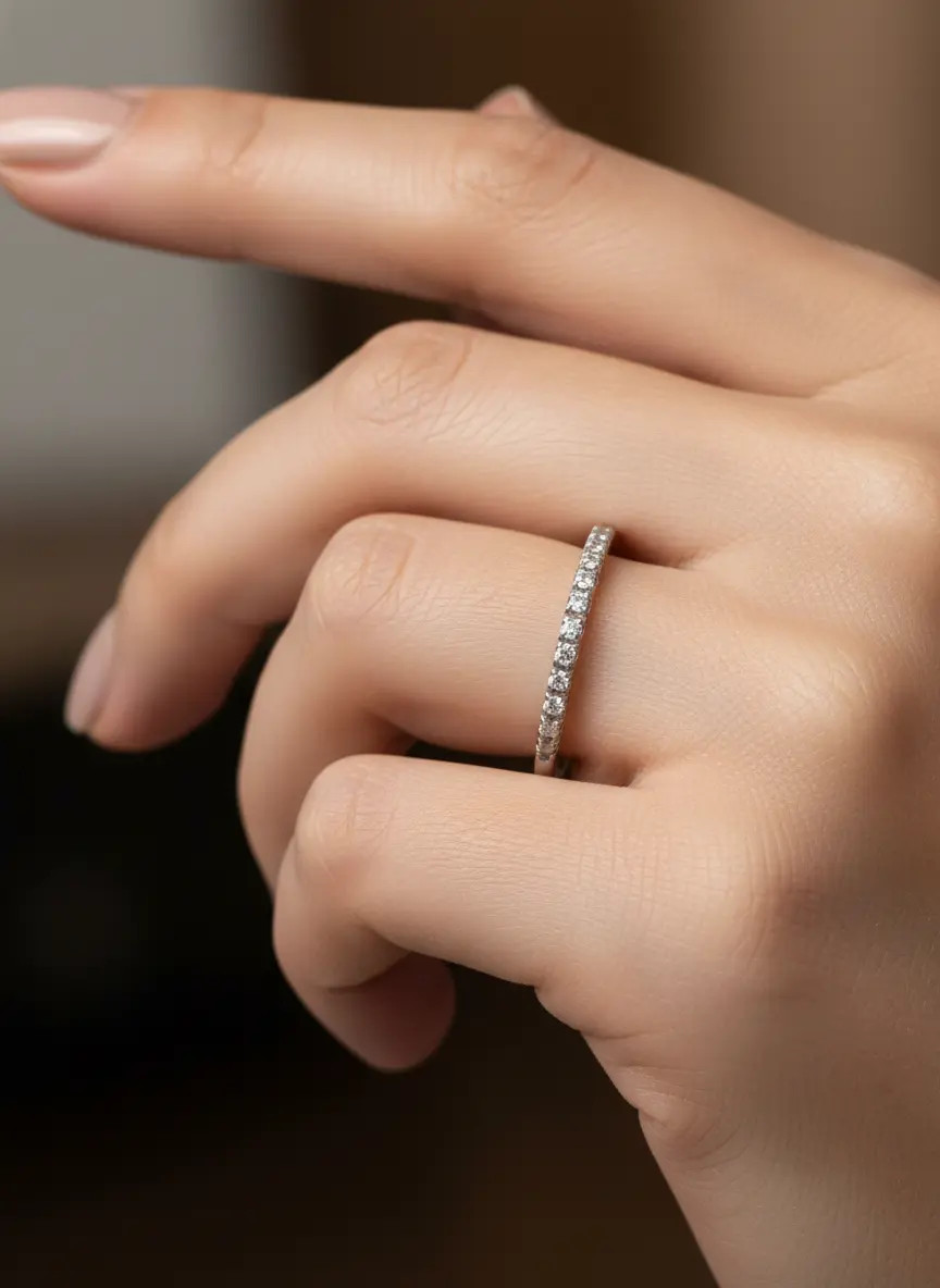 Martina es una sortija de media alianza elaborada artesanalmente en oro blanco de 18 quilates, con una hilera de diamantes naturales E-VS perfectamente engastados. Su diseño clásico y luminoso la convierte en una joya versátil, ideal como anillo de compromiso, alianza de boda o regalo con significado.