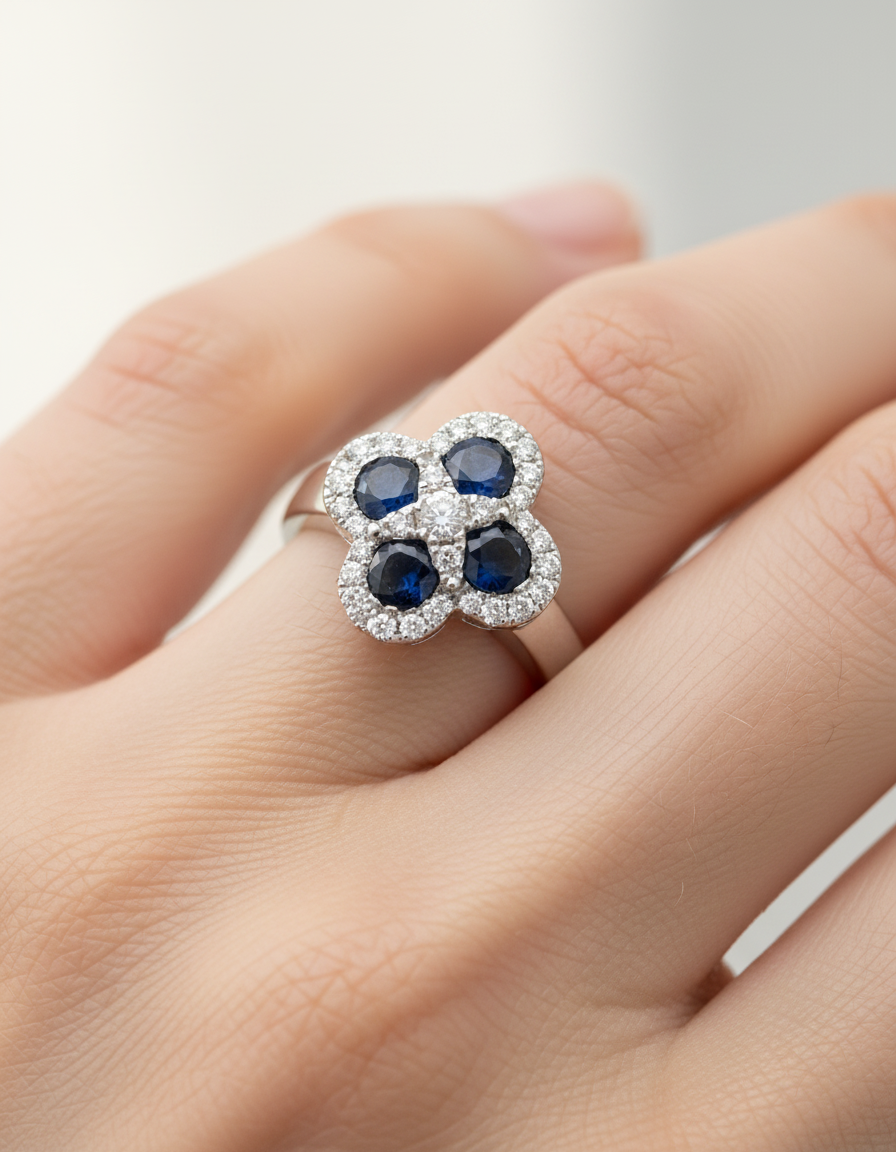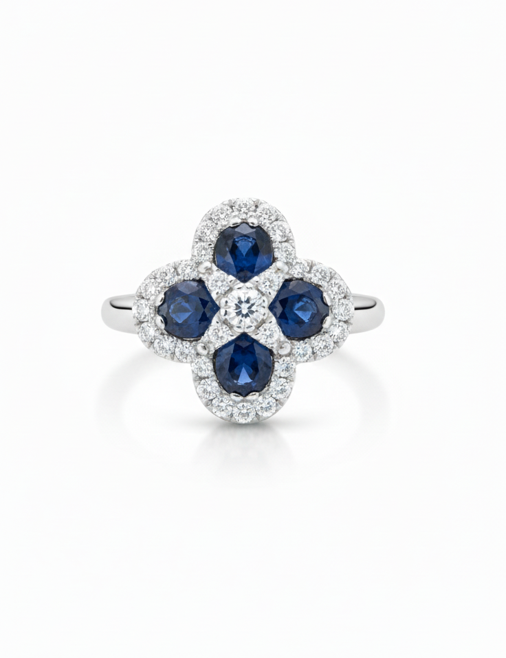 Descubre la elegancia y el brillo en un exclusivo anillo Trébol de Oro Blanco 18k, engastado con 4 zafiros azules y un halo radiante de diamantes. Una joya única que captura la luz y todas las miradas.