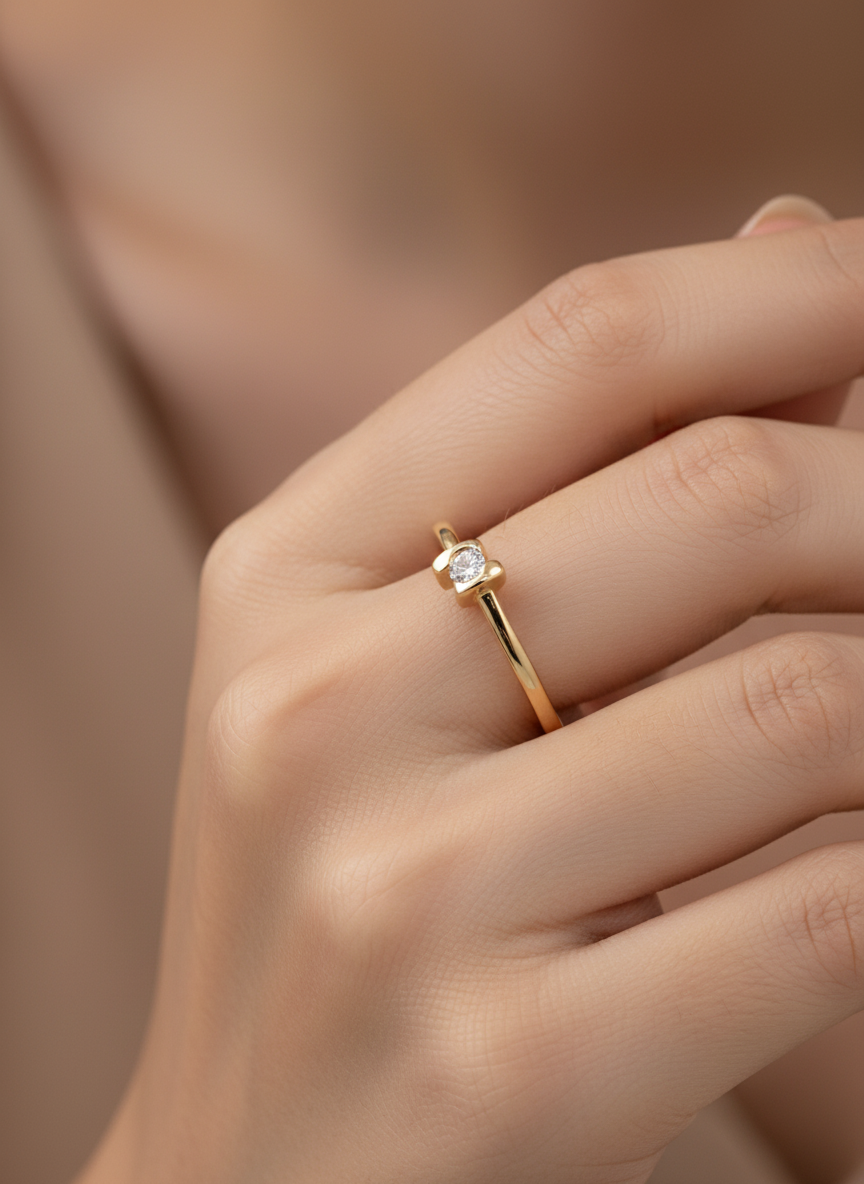 Un destello de promesa en oro amarillo de 18k. Este anillo con diamante D-SI de 0,05ct celebra el amor auténtico con una elegancia serena y atemporal.