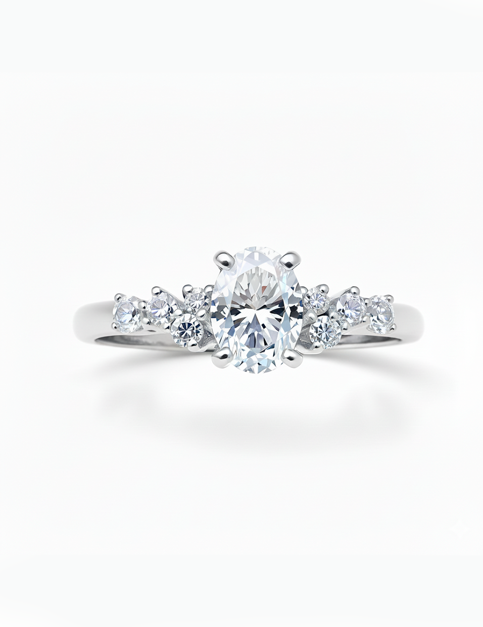 La sortija está elaborada en oro blanco de 18 kilates, diseñada para durar toda la vida. La combinación de diamante ovalado y redondos crea una apariencia elegante y sofisticada que le convierten en un regalo ideal como anillo de compromiso o aniversario.