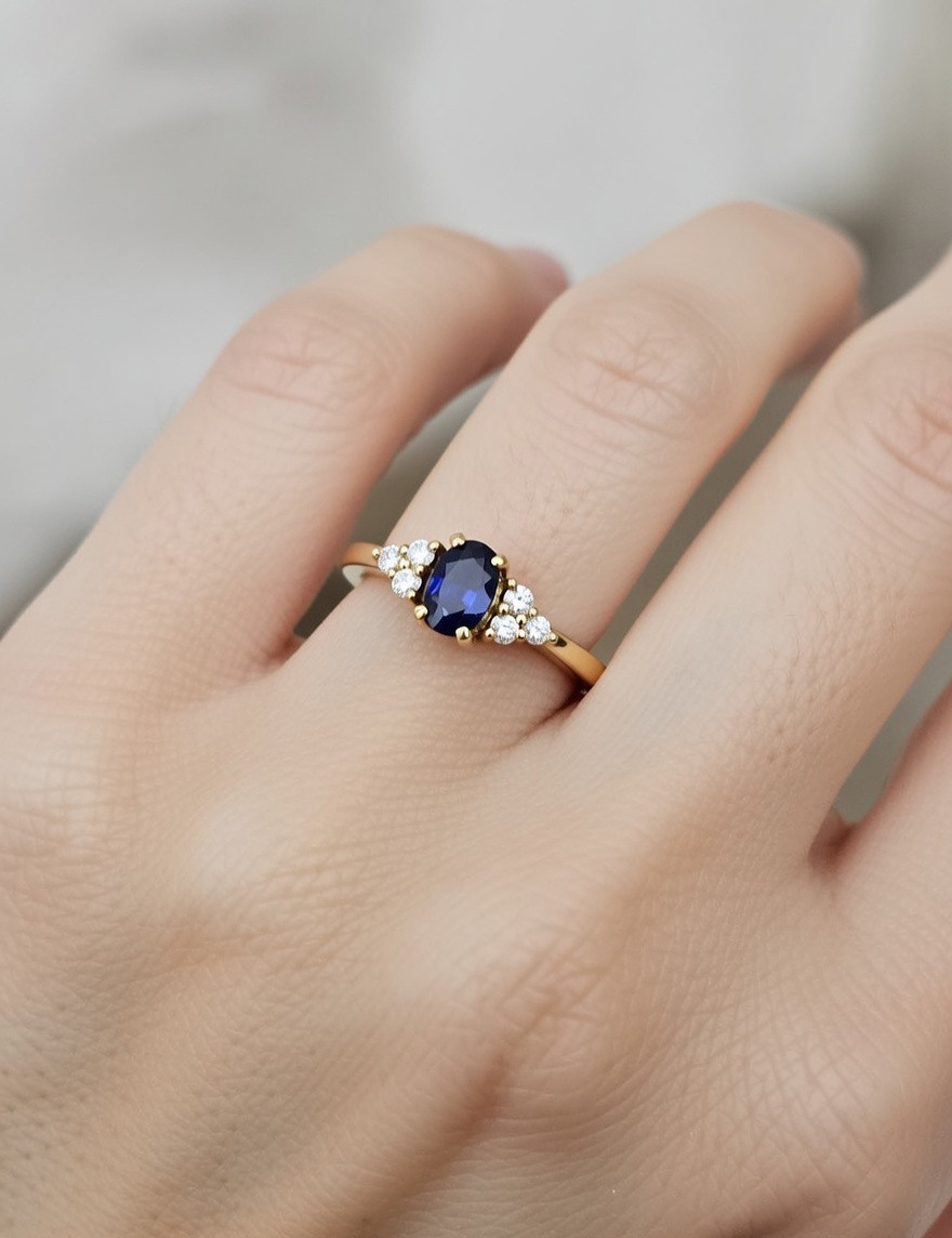 El Anillo Grace irradia un encanto clásico con su diseño de tres piedras realzado. Presenta un intenso zafiro oval central de 0.53ct, flanqueado por seis diamantes de talla brillante (total 0.12ct E-SI) que añaden un destello sofisticado.
