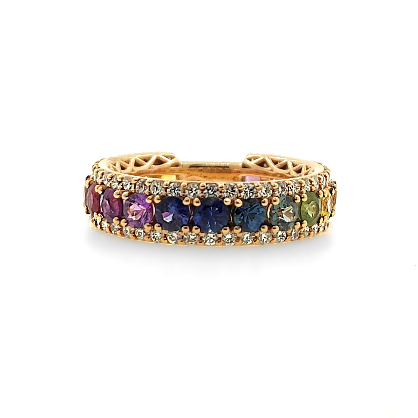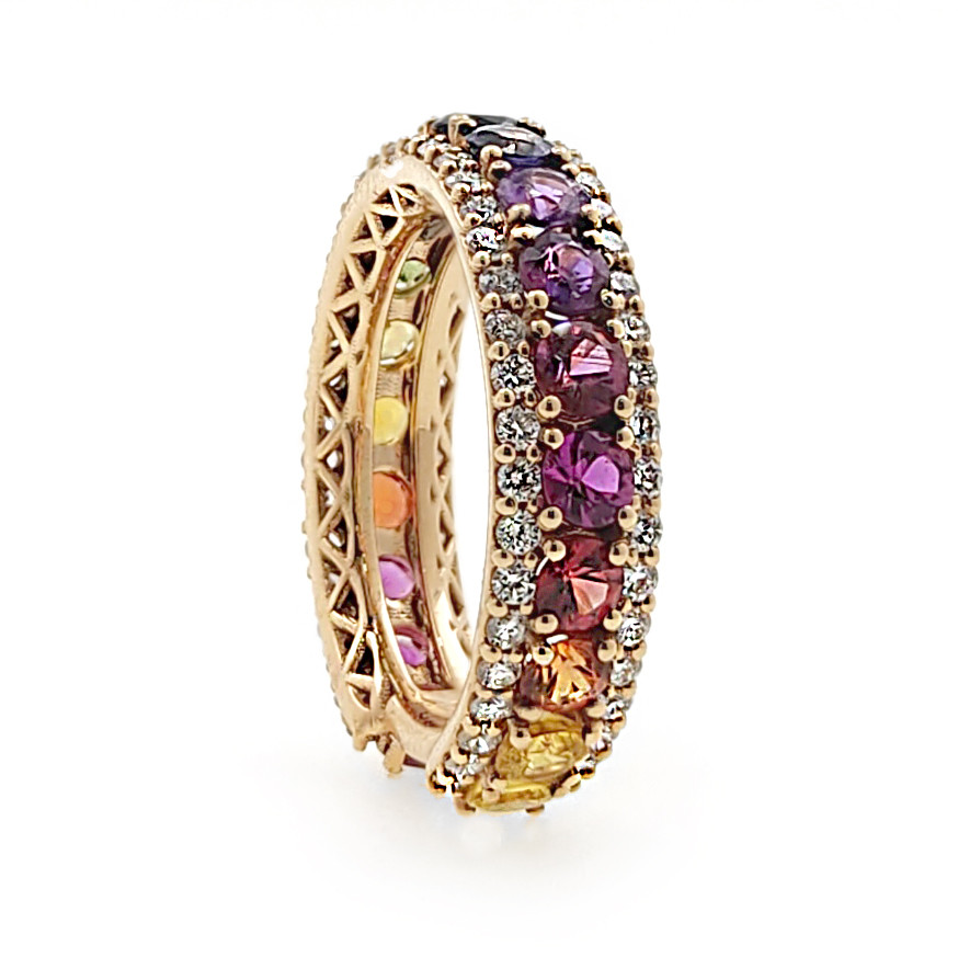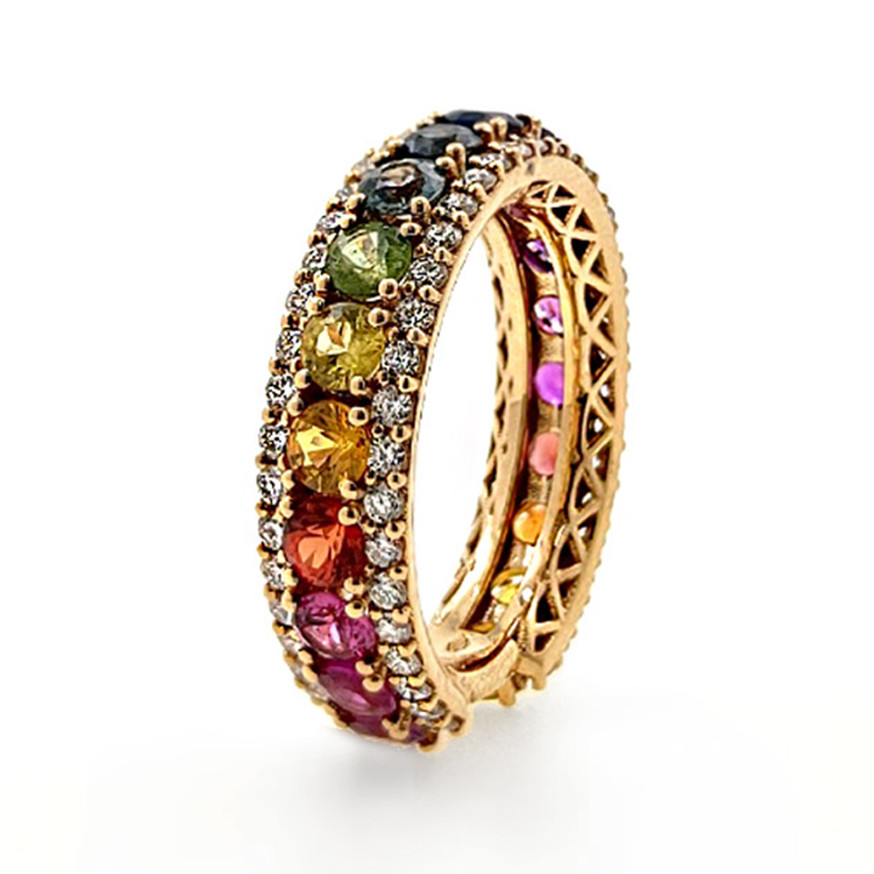 Anillo rainbow de zafiros multicolor y dos hileras de diamantes en oro rosa 18k. 2,60 quilates en zafiros de colores azules, rosados, amarillos, verdes, rojos... Dos hileras de diamantes blancos que suman 0,85 quilates de color G y claridad VS.