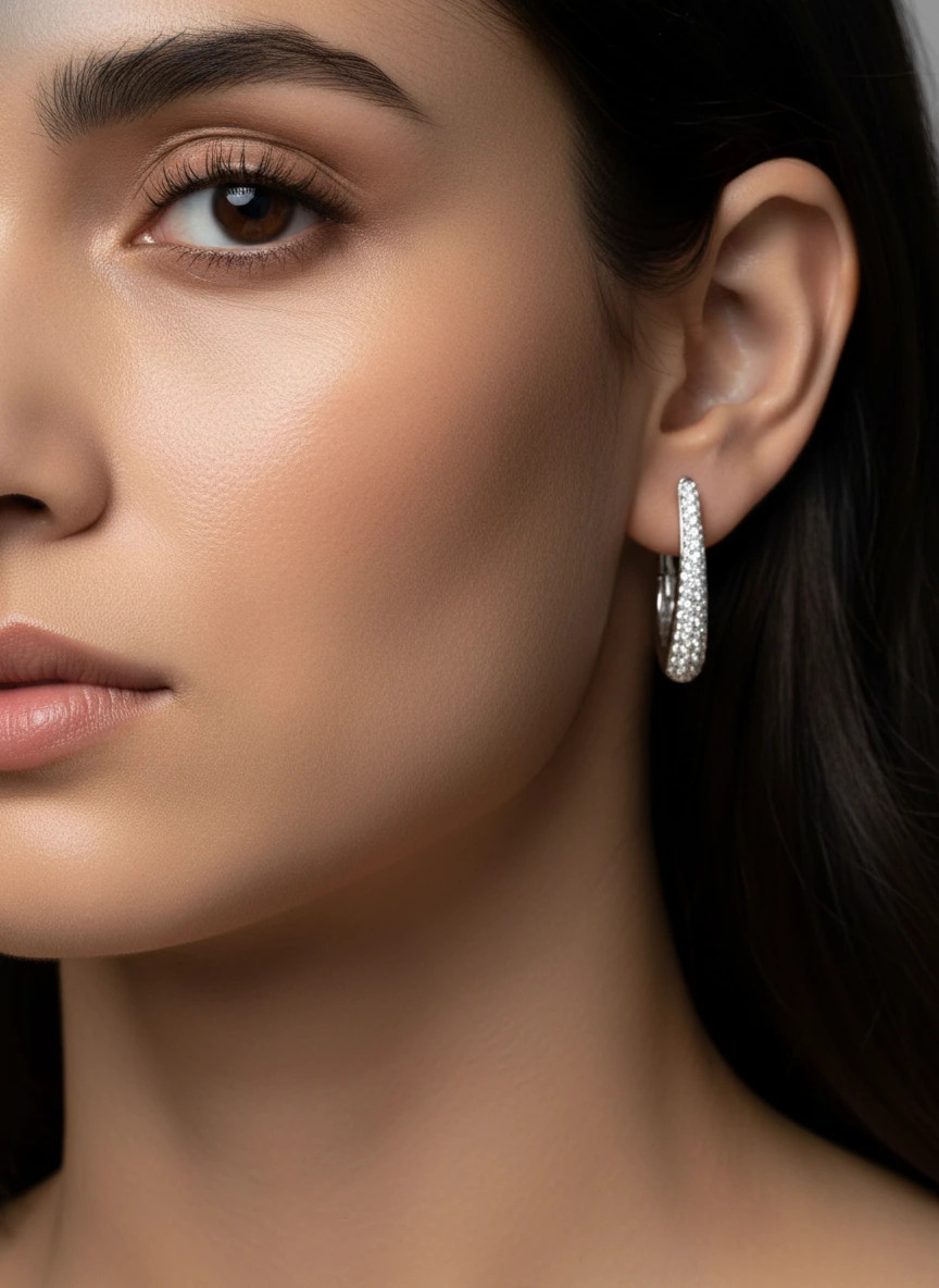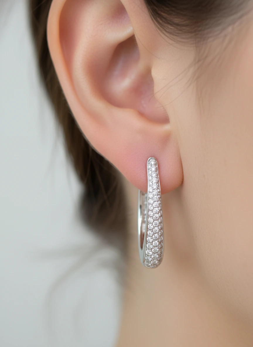 Pendientes criollas de diamantes pavé con un diseño ovalado y moderno, están elaborados en oro blanco de 18k. Su brillo es inigualable gracias a los 104 diamantes de talla brillante (0.68ct) de calidad premium E-VS.