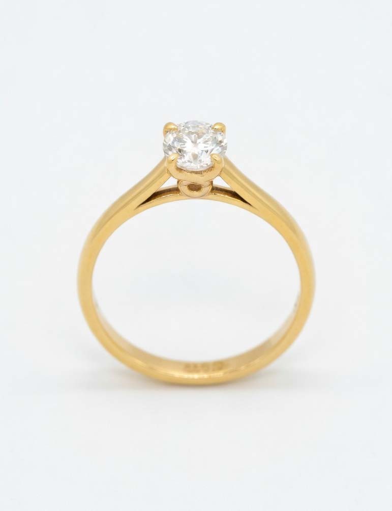Está elaborado en oro amarillo de 18 quilates, con un diseño de garras que eleva la piedra y potencia la entrada de luz, creando un efecto luminoso y elegante.