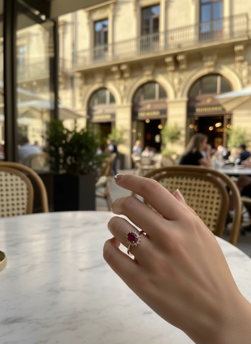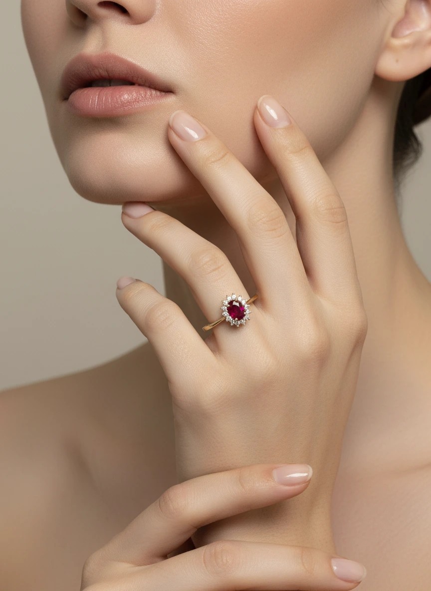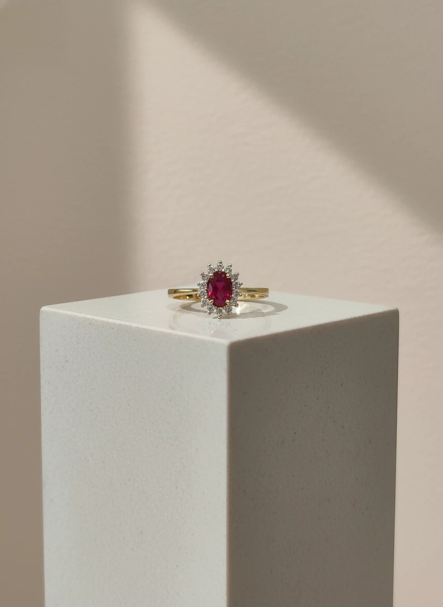 El Anillo Victoria es una pieza icónica de Joyería Marga Mira, creada para mujeres que buscan una joya con carácter, color y distinción. Su rubí oval de 4x6 mm (0,66 ct) destaca por un rojo intenso y vibrante, realzado por un halo de 14 diamantes (0,17 ct) que aportan un brillo espectacular.
