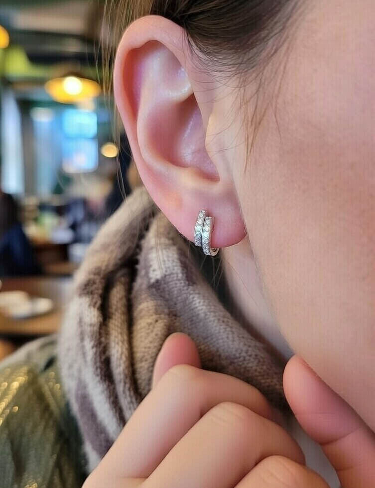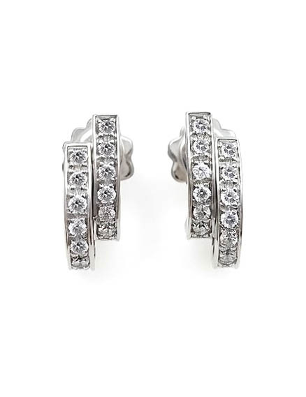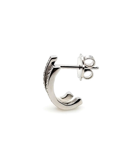 Estos pendientes presentan un diseño de doble banda curva, totalmente engastado con 28 diamantes de talla brillante (0,32 ct). Fabricados en Oro Blanco de 18k y con diamantes de calidad E-SI1, ofrecen la apariencia de una media argolla ancha con la comodidad de un pendiente de botón. Son ideales para un estilo diario elegante, luminoso y duradero.