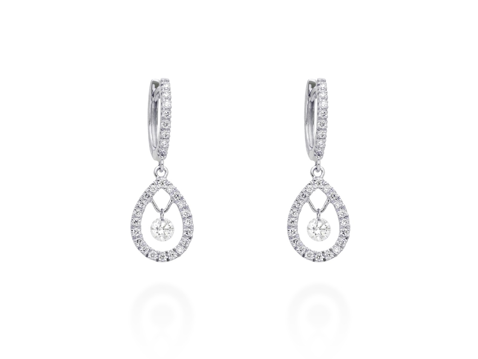 Estos pendientes destacan por su diseño en forma de lágrima con un diamante central suspendido de 0,15ct, que aporta un efecto de brillo en movimiento.