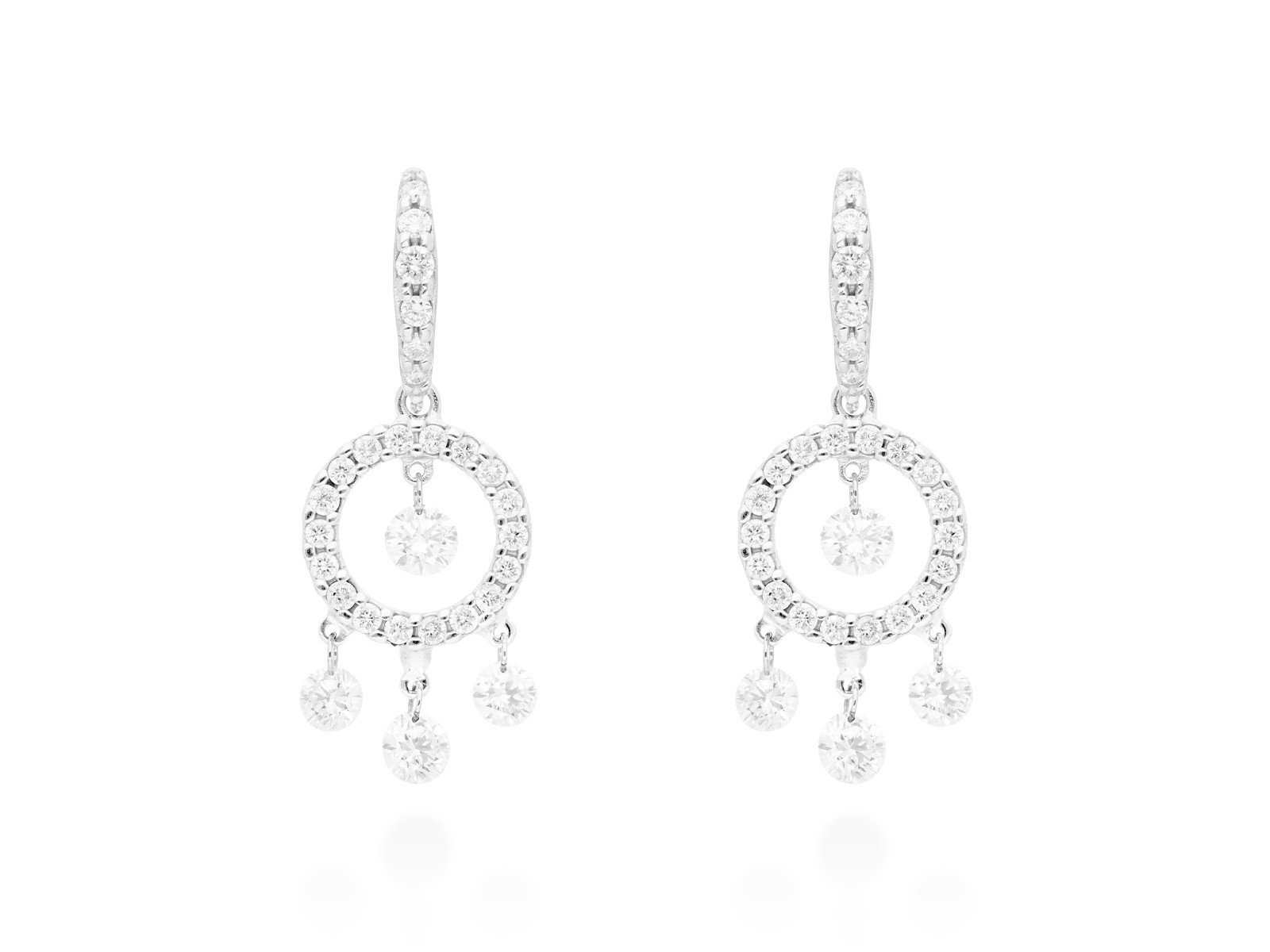 Su diseño articulado combina un aro con pavé de diamantes y una elegante caída con piedras suspendidas que crean movimiento y reflejos continuos. Están elaborados en oro blanco de 18 quilates con acabado pulido.