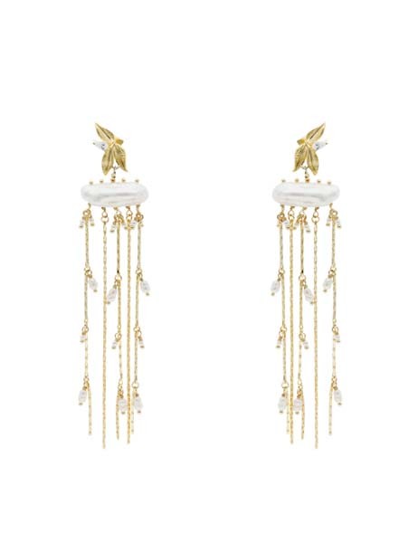 Pendientes largos de 12 cm con elegante diseño en cascada. Incorporan un motivo superior de hojas con circonita, una barra de nácar natural y finas cadenas adornadas con perlas cultivadas que aportan movimiento y luminosidad.