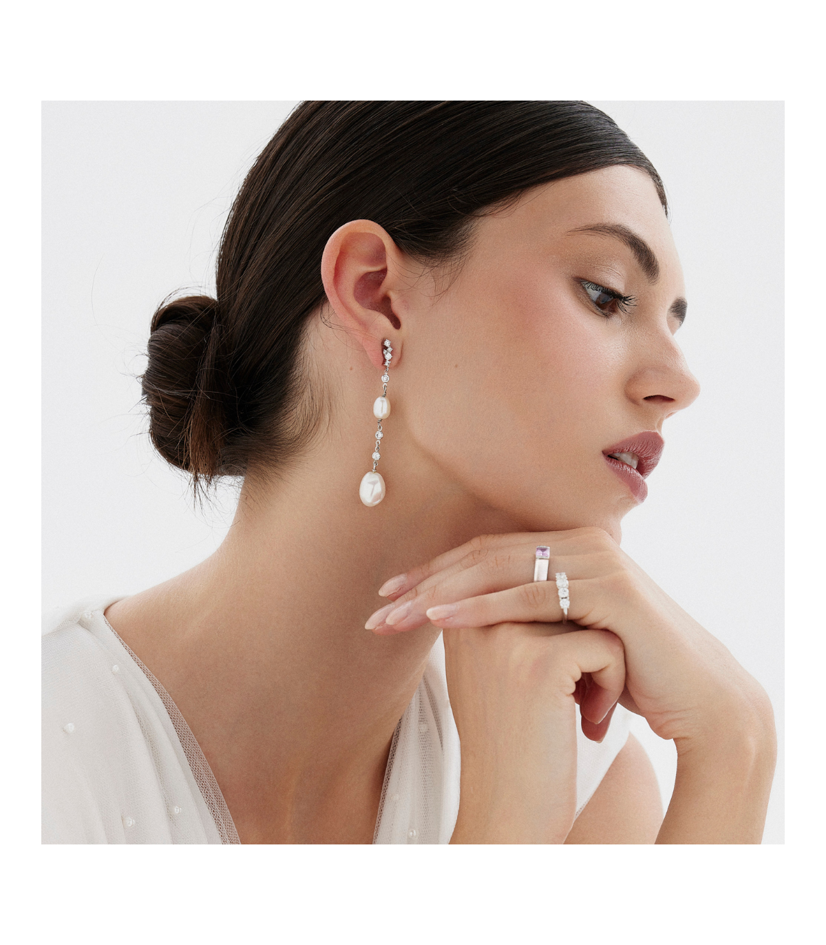 La colección Carlota rinde homenaje a la joyería de gala con un diseño lineal que estiliza el rostro. Sus pendientes combinan dos perlas, unidas por una delicada línea de circonitas, creando un efecto de movimiento y brillo elegante.