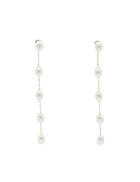 Los pendientes destacan por su diseño lineal con cinco perlas cultivadas que aportan movimiento y un brillo delicado.
