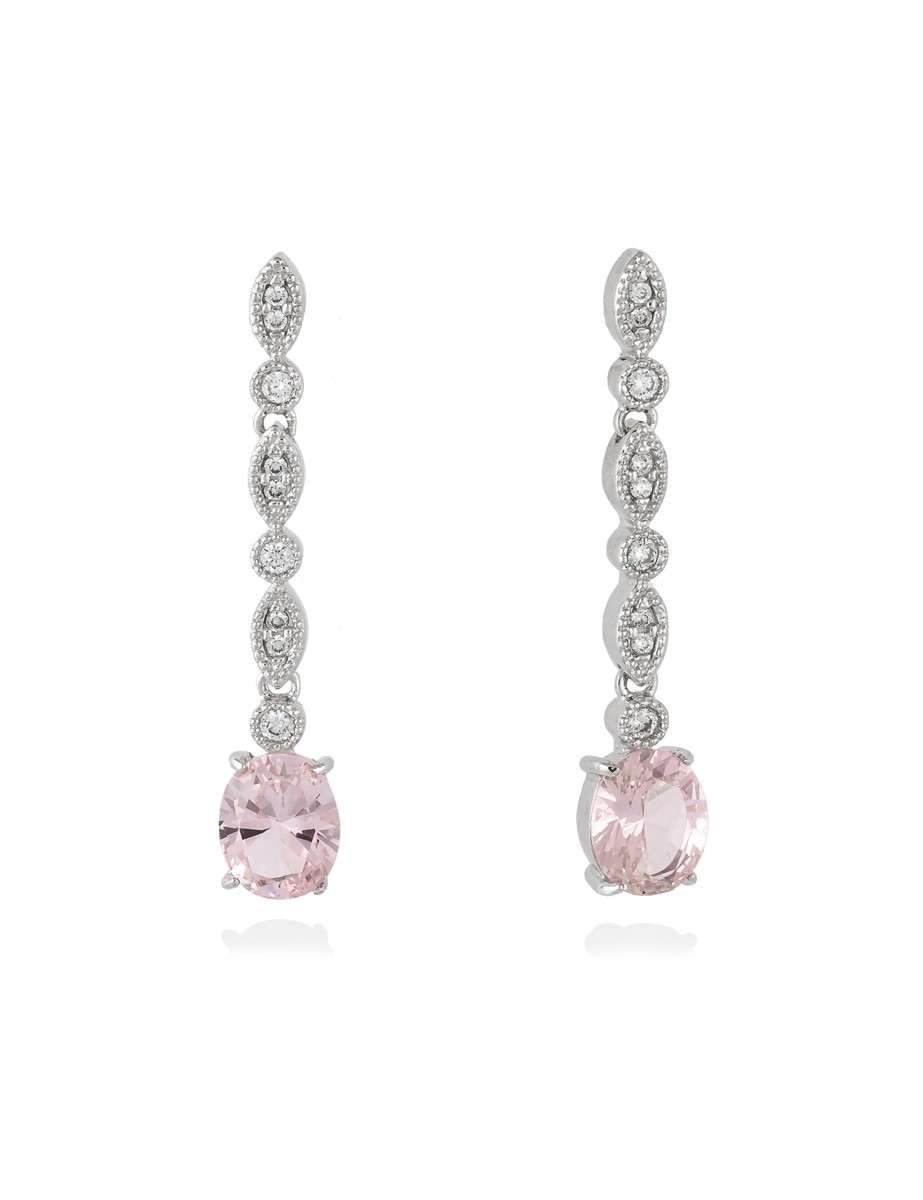 Los pendientes Leonor destacan por su diseño largo de inspiración geométrica, con tres motivos geométricos adornados con circonitas blancas y una morganita rosa que aporta un toque cálido y elegante.