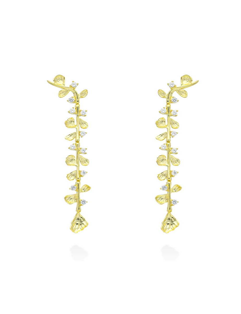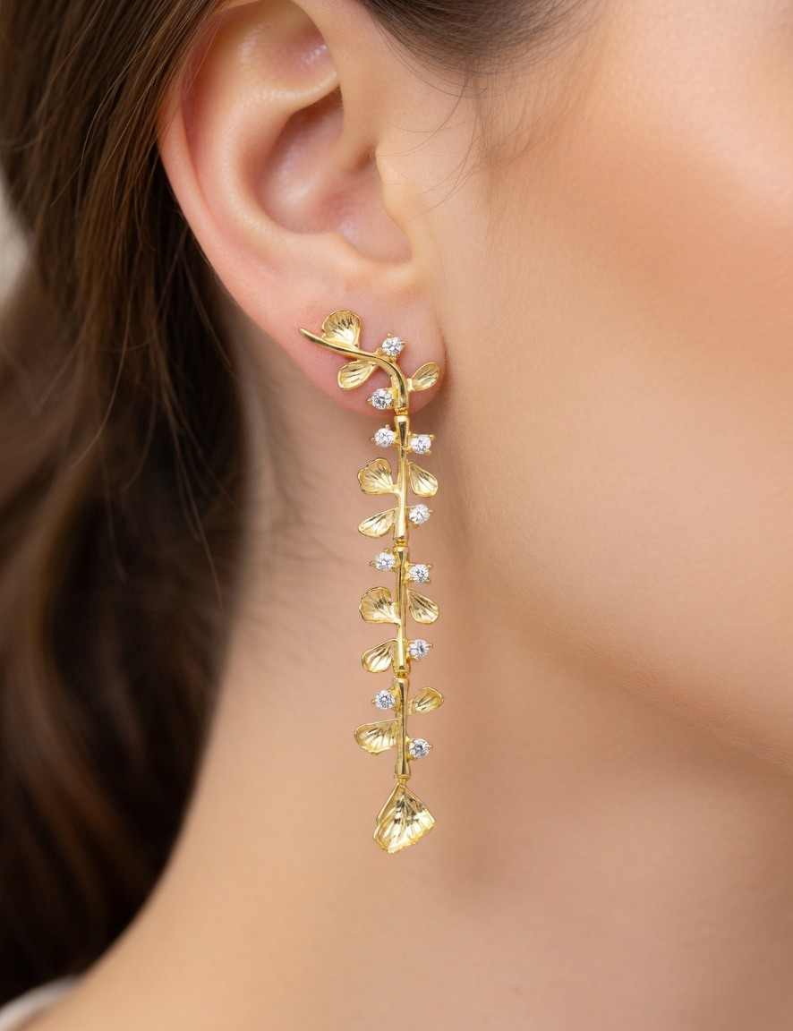 Los pendientes Guipur XL destacan por su diseño largo en cascada con motivos de hojas, decorados con circonitas que aportan brillo y movimiento.