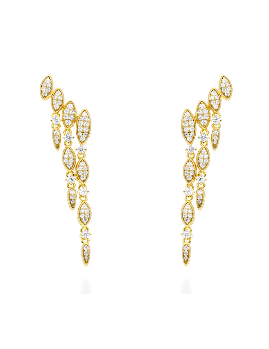 Estos pendientes destacan por su diseño en cascada con formas geométricas inspiradas en la naturaleza, adornadas con circonitas blancas que aportan un brillo continuo y elegante.
