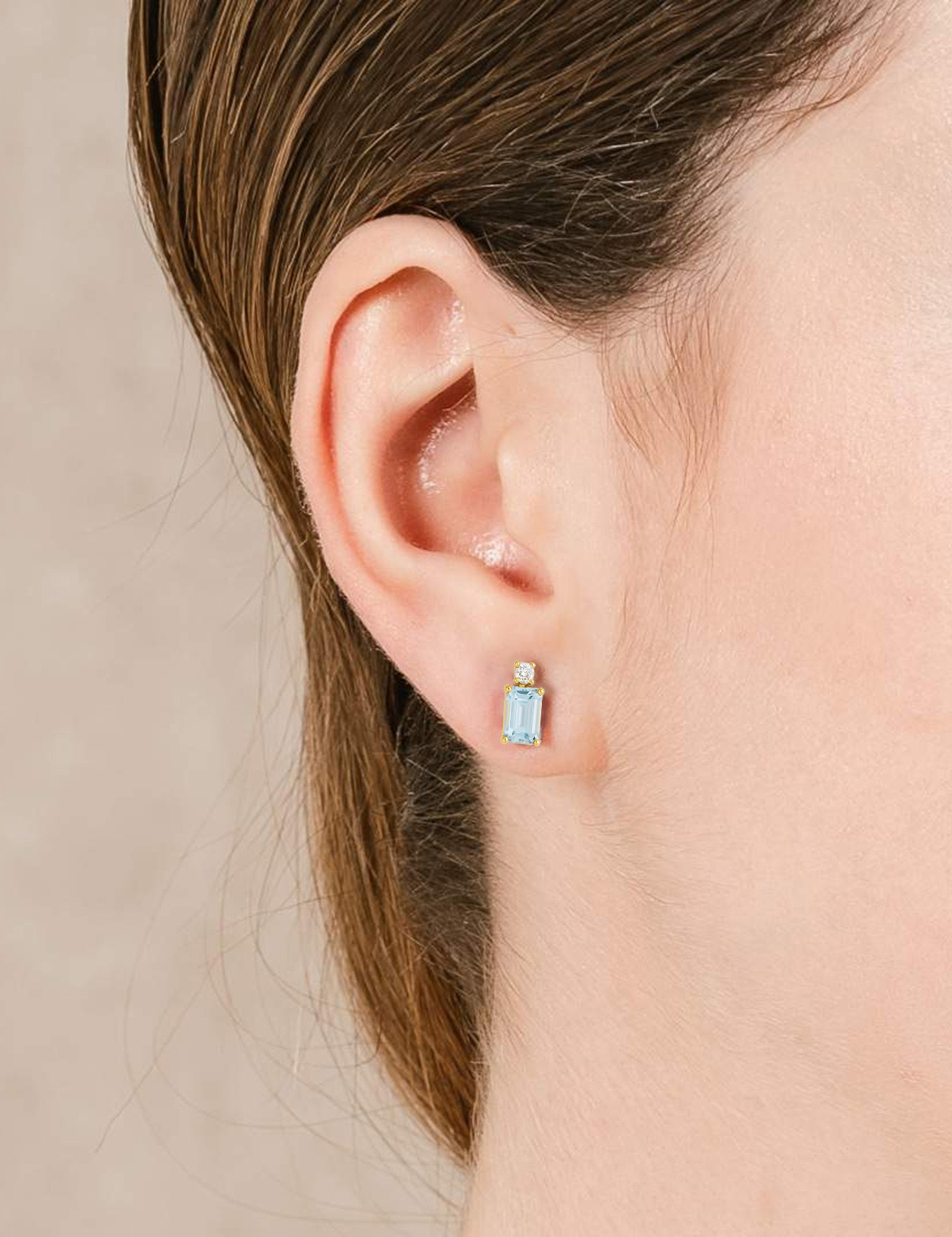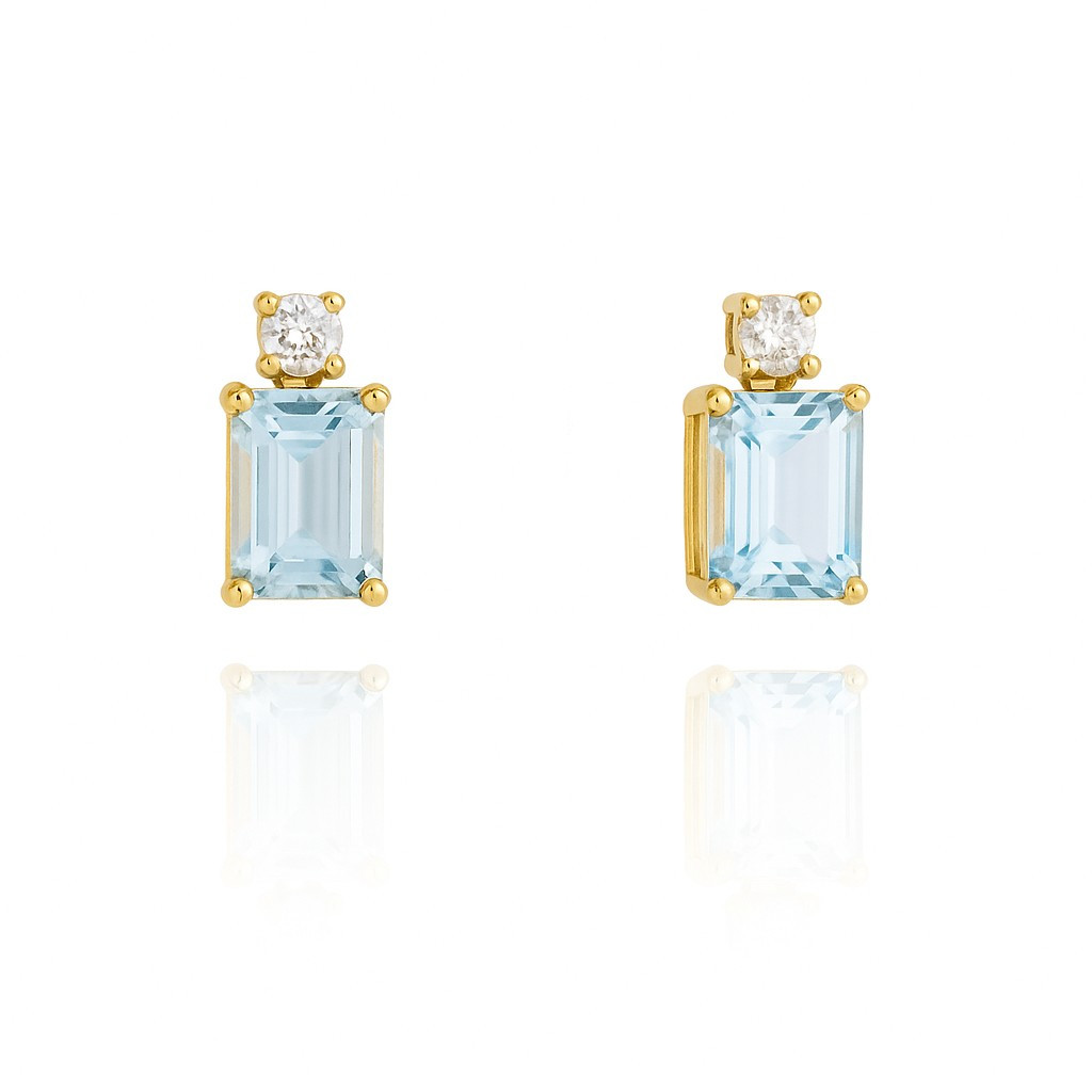 Pendientes de aguamarina y diamante en oro amarillo de 18k, con diseño minimalista y cierre de presión. La aguamarina de forma rectangular se combina con un diamante superior que aporta un toque de brillo sutil. Una joya refinada y versátil, perfecta para el día a día o para ocasiones especiales como bodas, aniversarios, cumpleaños o el Día de la Madre. Simbolizan serenidad, luz y elegancia atemporal.
