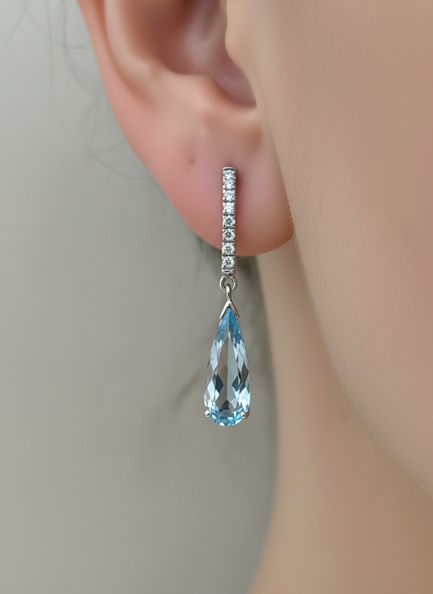 Los pendientes largos de aguamarina en talla pera y diamantes brillantes son mucho más que una joya: son una declaración de estilo, sofisticación y eternidad.