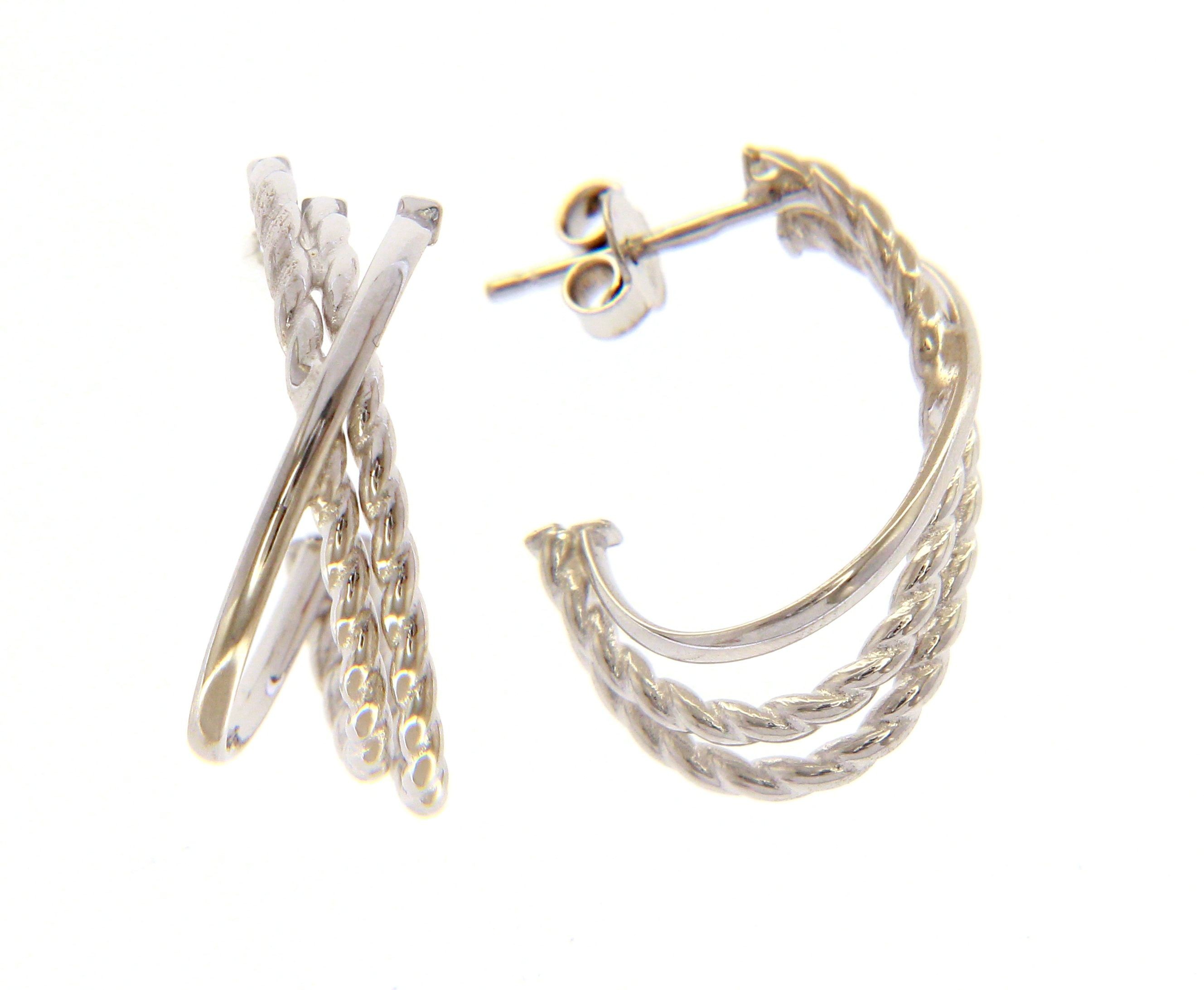 Pendientes de oro blanco con forma de aros cruzados con rizos.