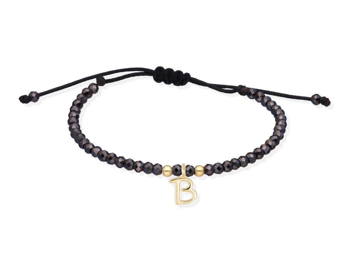 Celebra tu individualidad o la de alguien especial con nuestra distinguida pulsera de inicial 'B'. Oro amarillo 18k resplandeciente, su brillo se entrelaza con el enigmático destello de espinelas negras facetadas. Elegante, con cierre ajustable de macramé, es una declaración de estilo atemporal para capturar miradas y contar una historia única.