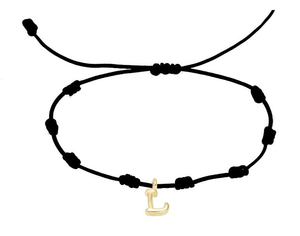 Pulsera personalizada con una inicial letra L de 7mm en auténtico Oro Amarillo de 18k, montada sobre un resistente cordón de seda náutica negra. Cuenta con un cierre de nudo corredizo para un ajuste perfecto a cualquier muñeca. Su diseño minimalista y versátil la hace ideal para el uso diario, para combinar con otras joyas o como un regalo cargado de significado. Una joya elegante que combina calidad y personalización.