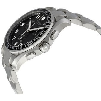 Reloj de hombre con movimiento de cuarzo analógico cronógrafo. Caja y correa de acero. Esfera negra con calendario. Permite la medición de tiempos cortos de 1/10 de segundo. Contadores de 60 segundos y 30 minutos. Escala taquimétrica. Funció de tiempos intermedios. Diámetro 41mm. Resistente al agua 100m. Cristal de zafiro.
