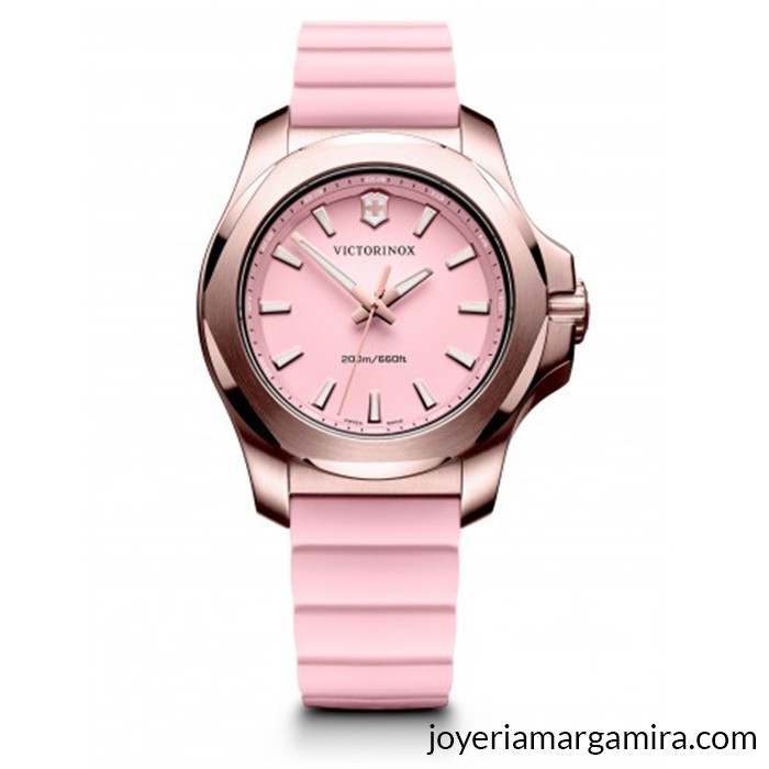 El reloj Victorinox I.N.O.X. V241807 viene con esfera y correa de color rosa pálido, adornada con PVD de oro rosa para las manos y los marcadores.